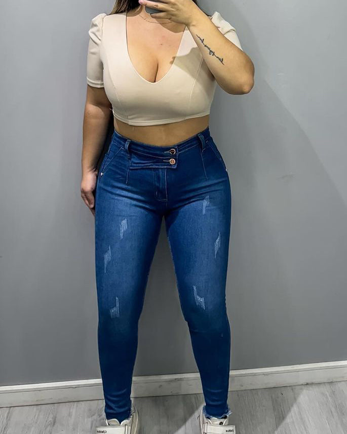 Hochgeschnittene Slim-Fit Stretch-Jeans