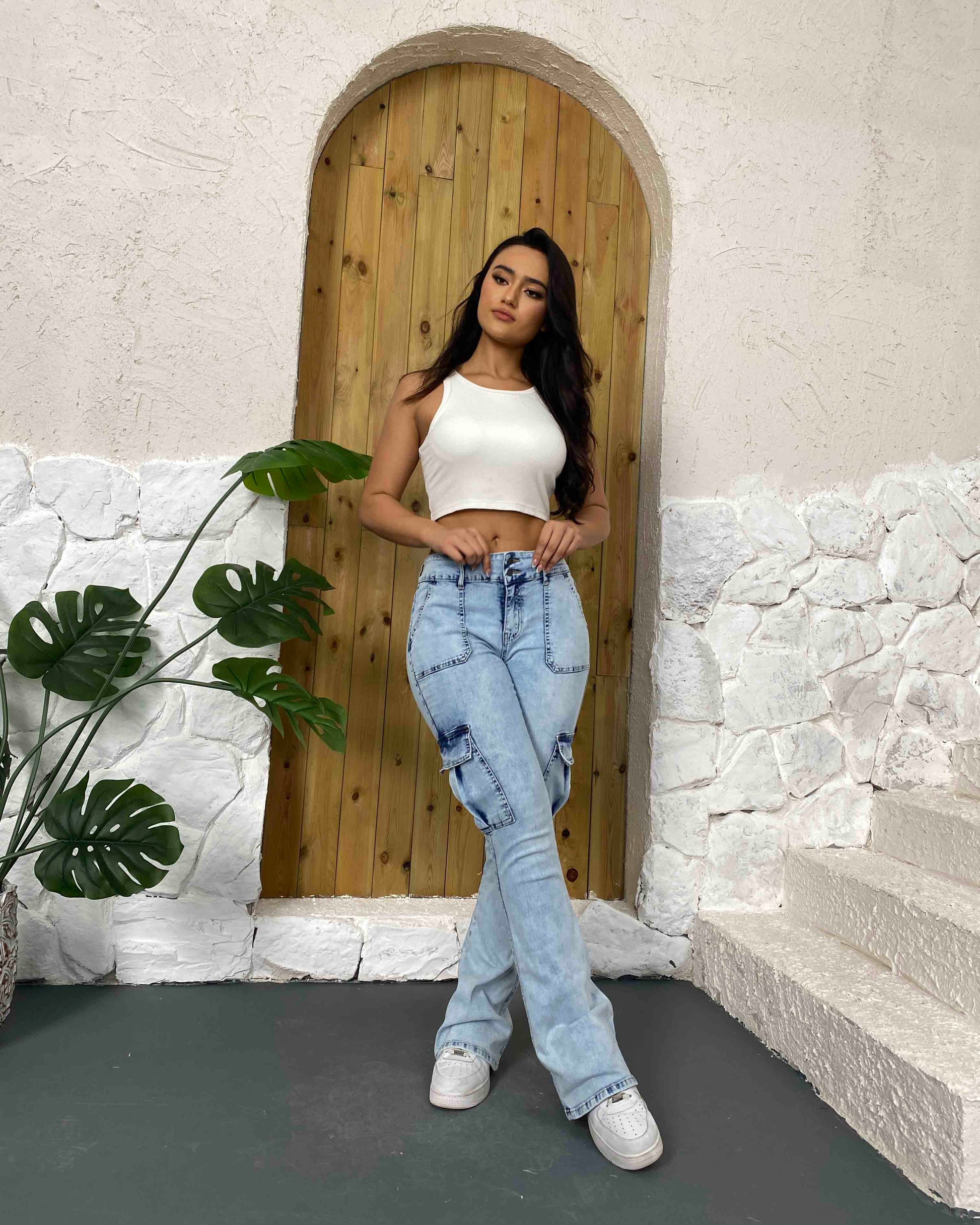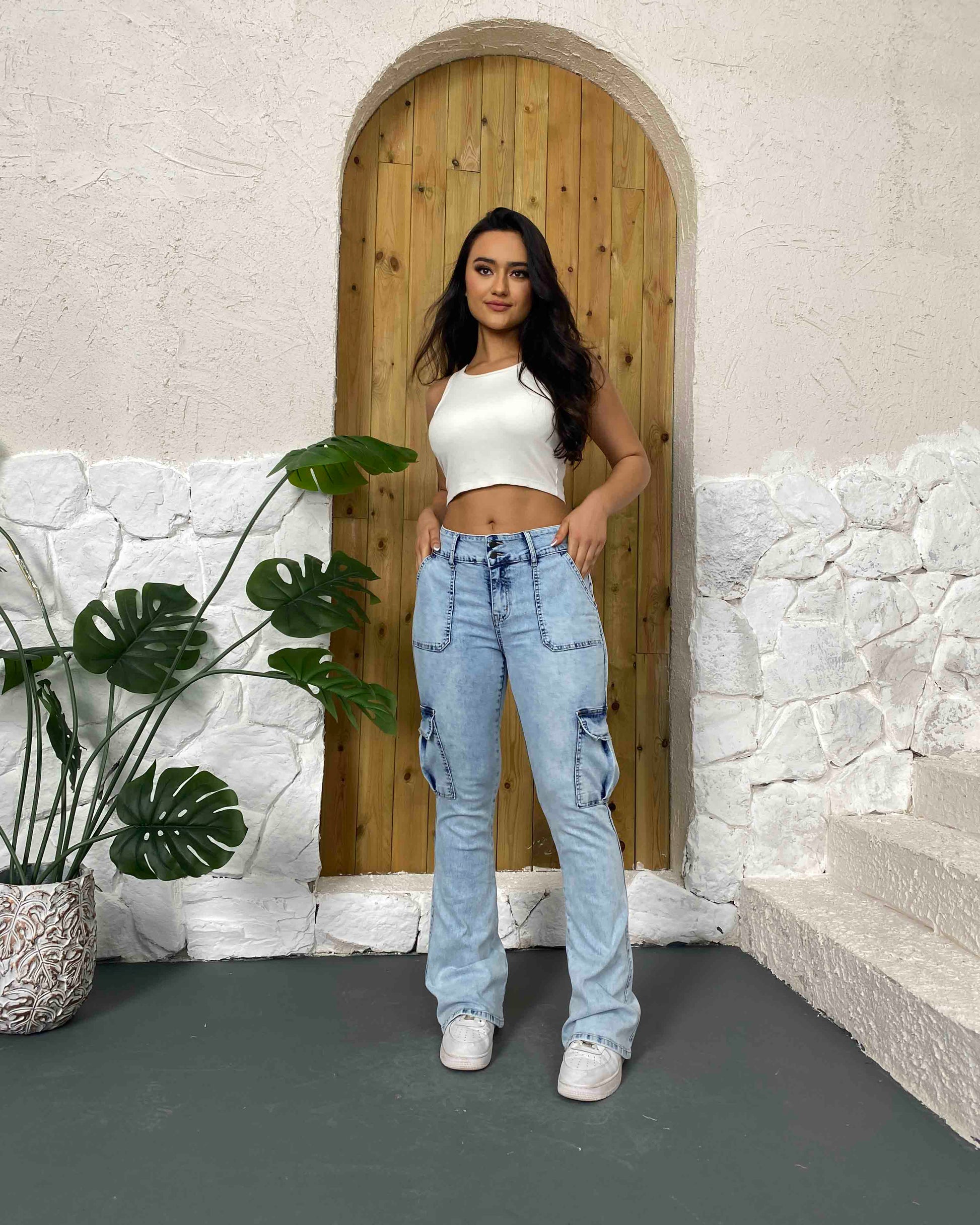 Mehrfachtaschen Doppelknopf Mid-Rise Flared Cargo Jeans